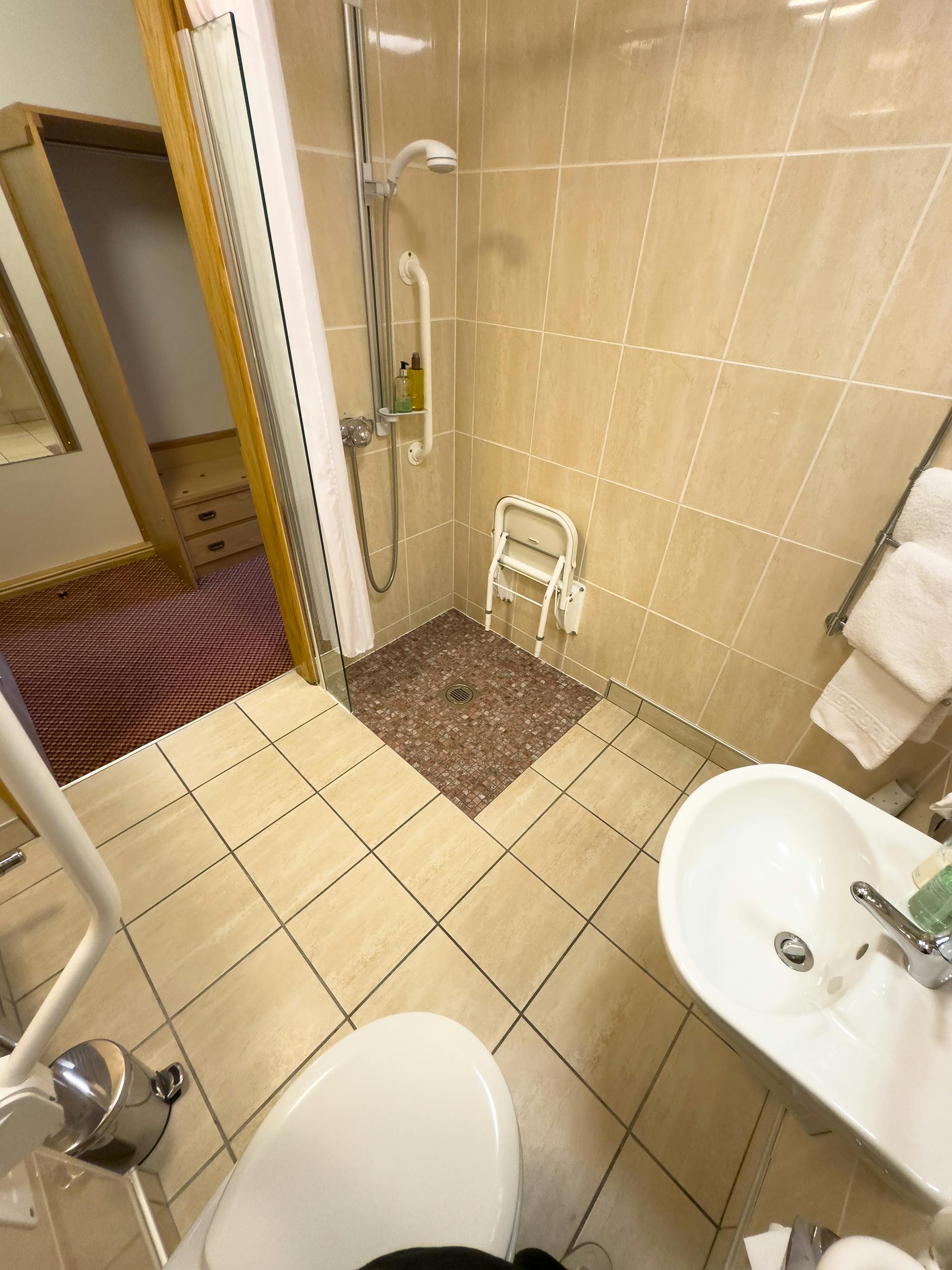 The en-suite wet room includes a floor-level access shower, lowered basin and grab rails. Emergency pull cords are provided in both the bathroom and the bedroom. There is ample space for wheelchair access throughout, offering a relaxed and comfortable stay.